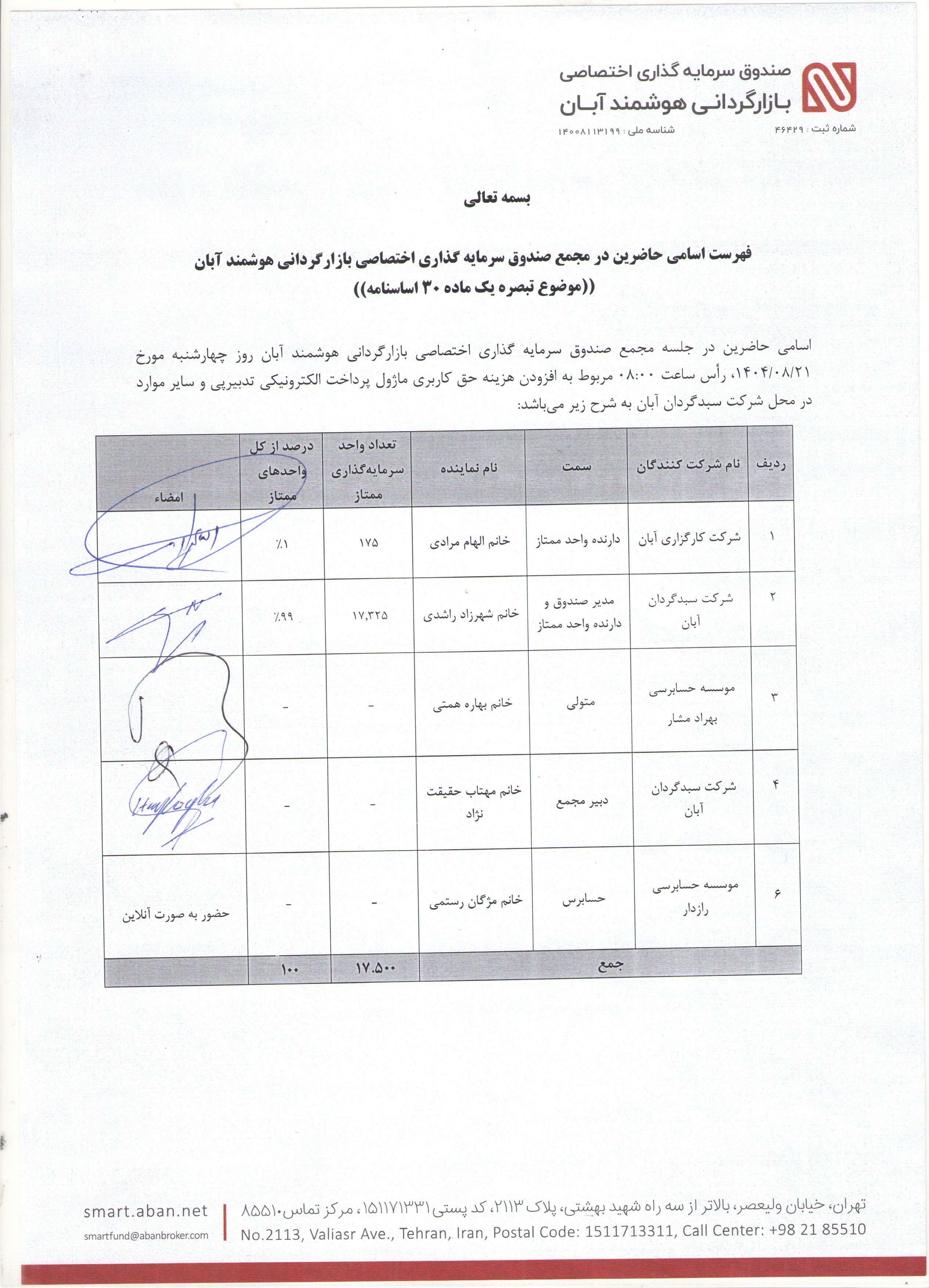 | مقدمه | فهرست اسامی مجمع صندوق سرمایه گذاری اختصاصی بازارگردانی هوشمند آبان با موضوع افزودن هزینه حق کاربری ماژول پرداخت الکترونیکی تدبیرپی مورخ ۱۴۰۴/۰۸/۲۱ ساعت ۰۸:۰۰ |