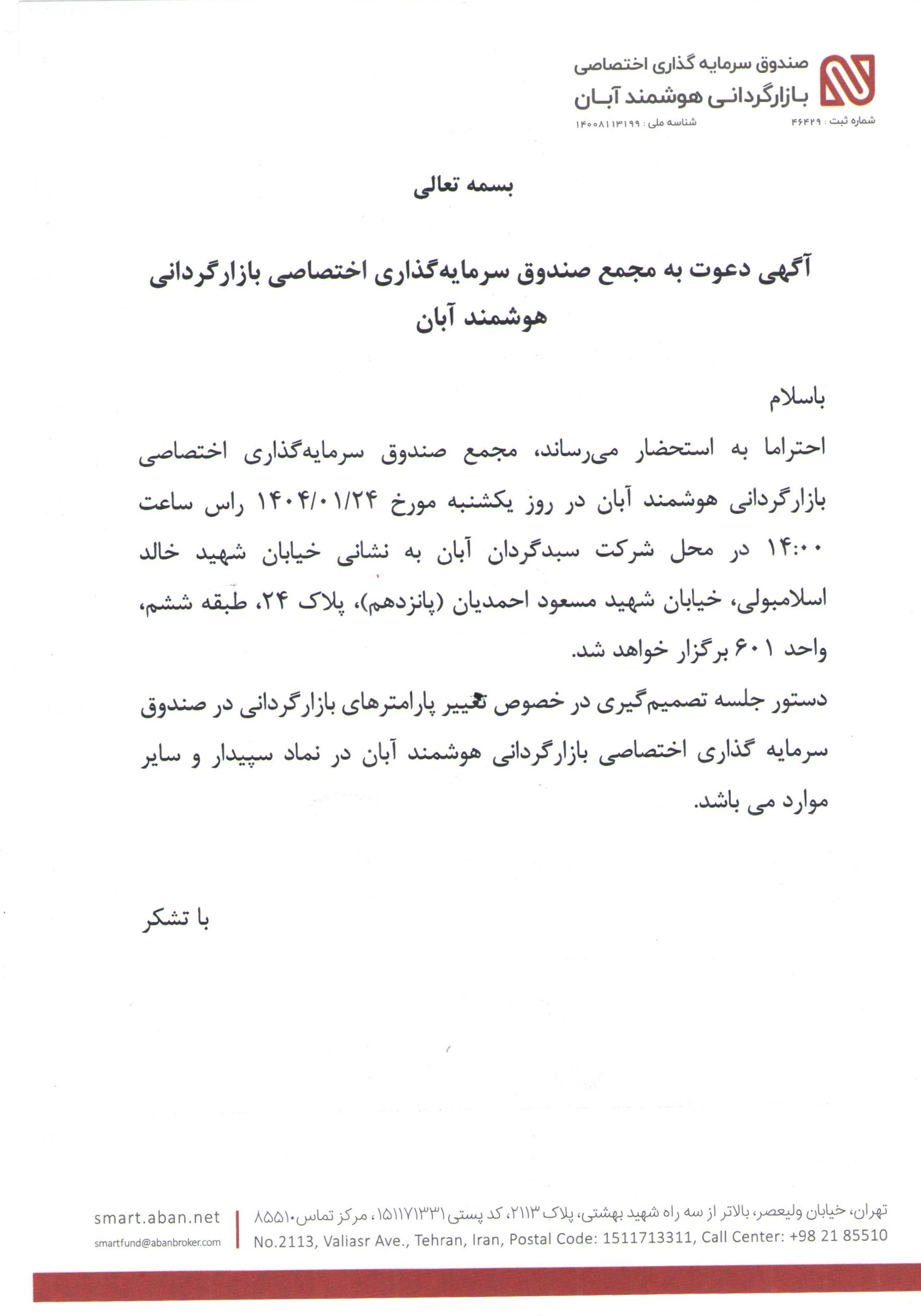 | مقدمه | آگهی دعوت به مجمع صندوق سرمایه گذاری اختصاصی بازارگردانی هوشمند آبان با موضوع تغییر پارامترهای بازارگردانی در نماد سپیدار مورخ 1404/01/24 |